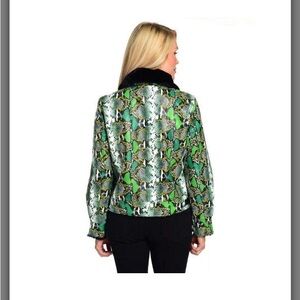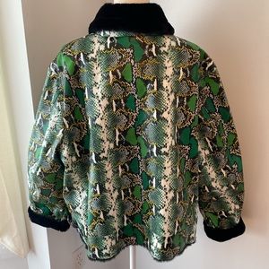 Mod X. Size 3XL faux leather buckle detailed faux fur lined and collar and cuffs Reptile print. 25 inches long and 29 inches pit to pit when zipped up. Excellent condition