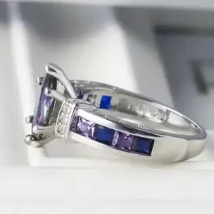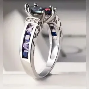 New Elegant fashion Inlaid colorful Mystic purple Synthetic Cubic Zirconia ring with blue & Purple stones on the sides. Zinc Alloy Silver plated. Size 9. Comes in pink ring box.