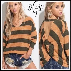 Brand New with Tags! Gorgeous Open Back Knit Sweater. Orange & green striped design. V-neck. Featuring an open back & low gathered twist. Imported.