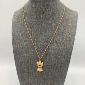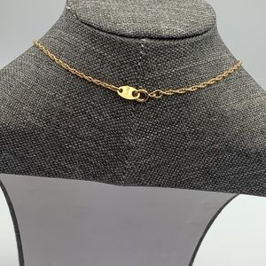 This Vintage Avon Blue Birthstone Angel Pendant Necklace is a stunning piece of jewelry perfect for any occasion. Featuring a charming angel pendant with a blue gemstone, this necklace is a timeless classic that will add elegance to any outfit. The pendant is gold plated and signed by Avon, and the necklace is 16 inches in length with a spring ring closure. Pendant measurement: 0.6”wide and 1.3” length