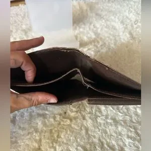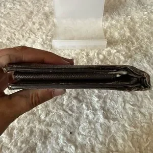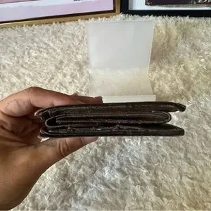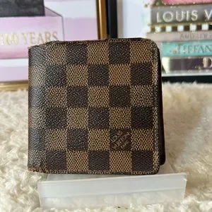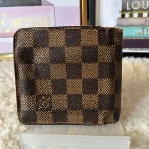 100% authentic men’s Louis Vuitton Damier Ebene bifold wallet. In good used condition. Has moderate corner and edge wear. The separation was fixed by the billfold. The canvas is still bright and shiny. Corners are the call outs. All callouts photographed please see all photos. Interior is brown leather and clean. Coin pocket has slight coin residue.