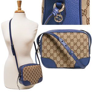 Unique Features: Blue and tan GG canvas Gucci Bree messenger bag with goldtone hardware, adjustable flat shoulder strap, blue pebbled leather trim, beige canvas lining, dual slip pockets at interior walls, 8 card slots and zip closure at top. Goldtone Interlocking G charm. Wear on shoulder or cross body.
