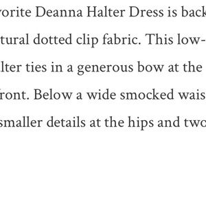 Everyone’s favorite Deanna Halter Dress is back, this time in a chic new textural dotted clip fabric. This low-cut convertible halter ties in a generous bow at the neck and can be crossed at front. Below a wide smocked waistband, the skirt flares to smaller details at the hips and two ruffled tiers.