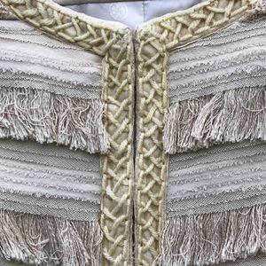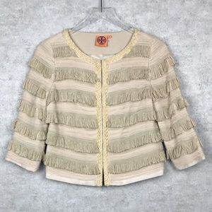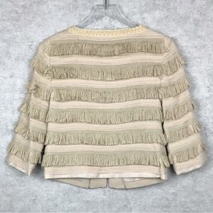 Darling silk jacket with cotton fringe detail. Hook and loop closure. Color: khaki/nude.