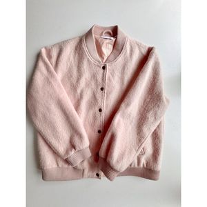 GANNI Inglewood Rose Smoke Pink Furry Wool Blend Varsity Bomber Jacket, Size L