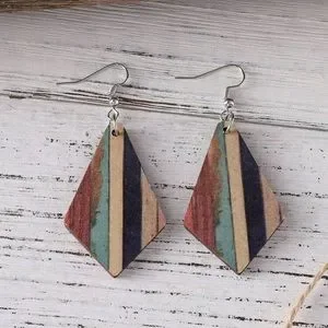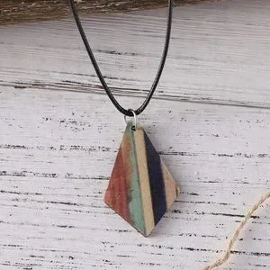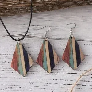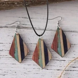3pcs/set Vintage Bohemian Style Turquoise Stripe & Geometric Wood Double-sided Pendant Earrings And Necklace Set