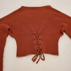 THIS IS A CORSET STYLE SWEATER DONE IN A RUST COLOR. IT IS A SIZE MEDIUM AND IS 100% ACRYLIC.