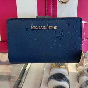 MICHAEL KORS Medium Jet Set Travel Crossgrain Leather Bifold Zip Wallet Navy NWT