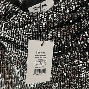 Showpo Joycee Midi Off Shoulder Thigh Split Sequin Dress in Gunmetal
