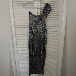 This formal number features an effortlessly chic off-shoulder bodice, figure-skimming fit and liquid-look sequins all over.