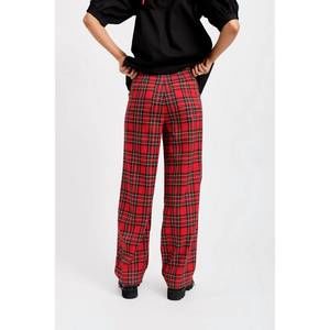 Our Sam Pant offers the timeless appeal of classic red plaid, with a low rise fit and baggy silhouette. Fabric: 64% rayon, 34% polyester, 2% elastane. Zip fly front and gold button hardware. Low-rise fit; size up if you're between sizes. 30'' inseam. The Sam pant fits true to size. Machine wash cold, lay flat, or hang to dry. Made in Canada.