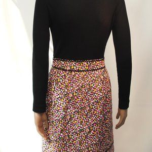 Late 60s-early 70s flower power dress by Sue Brett. Long sleeved black knit top with trim and skirt of tiny flower quilted fabric, trimmed in black rick rack. Closes in the front with 5 black buttons and a 6" zipper in the skirt front. Vintage Junior Sz 13. The black knit top is slightly stretchy. Bust 32"-36", waist 27-28" NO STRETCH, hips 40", sleeves 22" long, shoulder to waist 16", waist to hem 20". EXCELLENT CONDITION!