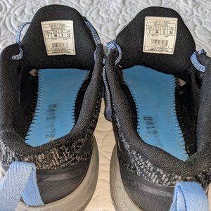 This is a Brooks Divide Trail Running Shoe Black/Blue in a Women's size 7 Medium. It is in used condition with signs of wear including very worn and scuffed toes and soles and I have taken the insoles out of them, so you would need to insert your own insoles. For some reason, when I wore these shoes the outside rubber-y part of the soles started to scuff and peel a lot. I think I must just hit my feet together when I run or something?! Anyway, I just want to be clear about that because this shows quite a bit. (I included the stock photo just to better show the style of the shoe, and a picture of the box to show the original style and UPC, but the box is NOT included in this listing.)