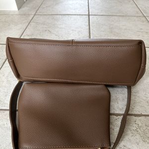 Brown Tote Purse Handbag Faux Leather w/ Makeup Cosmetics Bag. In great shape! No mildew, smoke or perfume smell. No rips, cracks, stains or other damage. Like new. Large tote: Adjustable strap, Magnetic snap. See pictures for measurements. Shipped with great care. Thank you for viewing this item and visiting my closet!