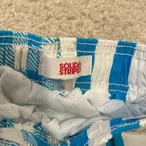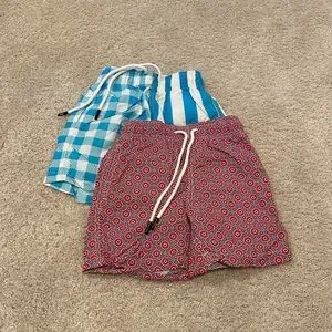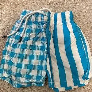 Boys bathing suit trunk shorts, drawstring waist, inner adjustable button waist. Both size 6, both Solid and striped designer brand. Runs small like a size 5. Limited edition and rare