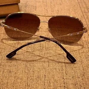 These Burberry Tara BE 3122 110913 womens aviator sunglasses, feature a gold metal frame and brown gradient lenses. Size and dimensions for the Burberry model BE 3122 are lens 59mm x bridge 14mm x temple 140mm. This frame will come with Burberry box, case, cloth and paperwork, and they can be fitted with your prescription by your eye doctor.