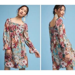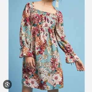 Anthropologie brand Maeve Milou beautiful floral dress, women’s size small. Turquoise background with pink, mauve, cream colored floral print. Smocking at the neckline, shoulders can be worn up or off shoulder, slight bell sleeves at the cuffs. Bust measures about 17 inches across, length about 36 inches with the shoulder in the up position. gorgeous and romantic! This dress is so pretty! Hard to find this print!!