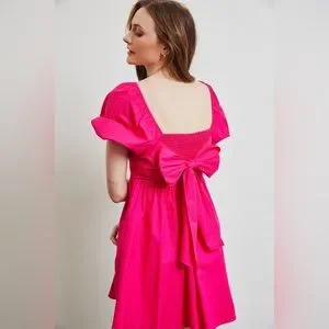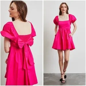 Puff Sleeve Baby Doll Dress with Bow Back and Pockets