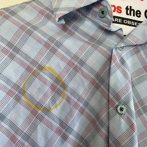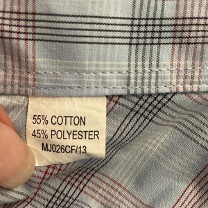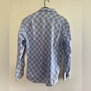 Ben Sherman long sleeve button up shirt. Blue with red stripes and black stripes. Size 3- Large. 50% cotton, 50% polyester. There is a small spot on the right upper chest. It may or may not come out in the wash. Please ask any questions!