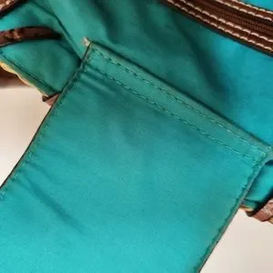 Good used condition - There are some stains on the interior lining on the bottom, the side pocket, on the underside of the closure flap and throughout on the top, please see the photos