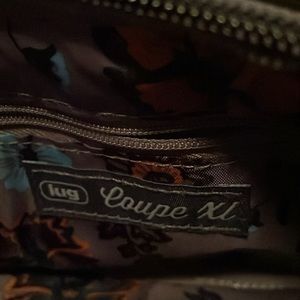Lug bag purple gray color black hardware. Very nice bag. Has card holder in one of the two compartments.