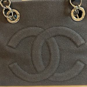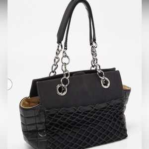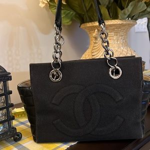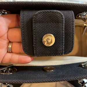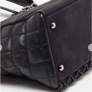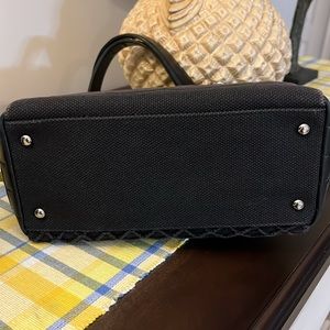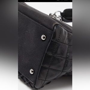 Made of leather and canvas. Exterior is black. Interior is cream. Silver tone hardware. Snap closure. Interior zipper pocket. Little bit of stain inside bag. In very good used condition.