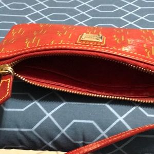 Red leather zippered wristlet with red leather interior and a pocket inside. 7x41/2