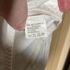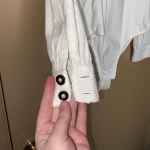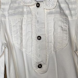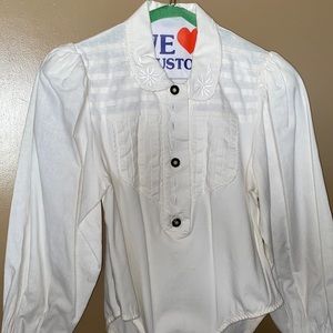 The top has the material of a blouse with beautiful, detailed accent and buttons (all still in tact!!!).