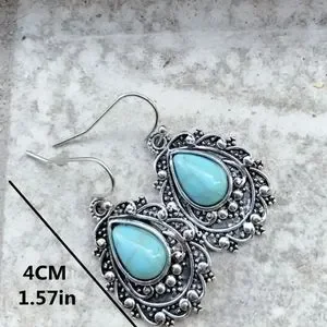 This pair of earrings features a teardrop-shaped turquoise colored stone set in a silver-toned metal frame.
