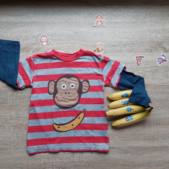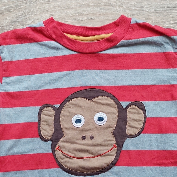 This listing is for a 2011 Mini Boden long-sleeve monkey tee. My eldest wore this not more than 2-3x. There is slit in the top layer of fabric on monkey's head (close-up in photo #9). It is on the tan layer but the red & grey stripes are unaffected. I did "trim" the monkey but I don't remember if *I* caused it or if it 🤔 was from something else. The tee has little to no washwear/fade but due to the small slit in the top layer of fabric I'll call the condition between guc and vguc.