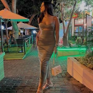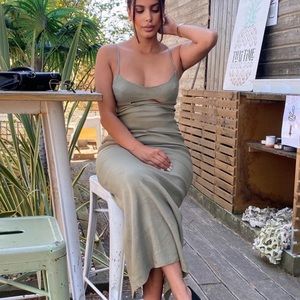 Dress made of a linen blend. Round neckline and adjustable thin straps. Cut-out detail on the chest. Back slit at the hem. Matching interior lining. Back fastening with crossover tie and invisible zip.