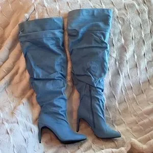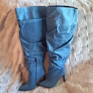 Cape Robbin Kitana Thigh High Fire Boots | Size Women's 9 | Stop Y'All These Are Absolute Stunners | Ultra Stylish Demin Appearance | Ruched | Zipper Sides | Never Worn | No Option But Center Of The Room In These 💋 | Shade Of Denim -Like Material Varies Just Slightly Throughout | A Couple Of Tiny Marks - Hardly Visible - Noted In Pics | Georgeous & Center Of Everything