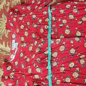 Adorable red base sunflower print dress with short sleeves and gold functional buttons all the way down the front.
