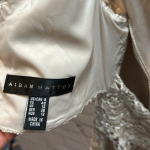 Stunning sleeveless Aidan Mattox lace jacquard sheath cocktail dress in champagne. This features an opening in the back and light boning on the sides for helping the shape.