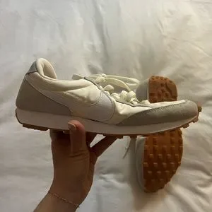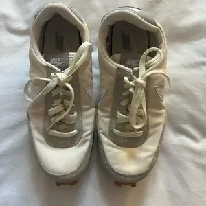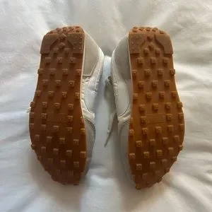 Description: White and beige tennis shoes with tan sole and white laces. Great condition!
