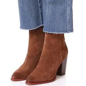 Brown suede ankle boots with a slight pointed toe. Approx 3.5” heel. Leather upper. Size 7. Good used condition. No box.