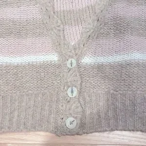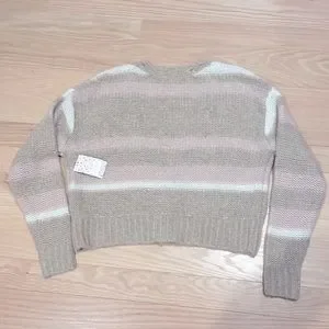 NWT size XS gorgeous beige, dusty rose & white stripe cropped cardigan sweater. Looks & feels very soft. V-neck has scalloped like edges. 3 buttons in front. Material is 51% acrylic, 21% nylon, 19%, wool and 9% alpaca. Hand wash cold.