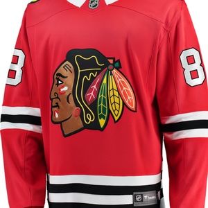 Let everyone know who your favorite Blackhawks player is with this Chicago Blackhawks Patrick Kane Home Breakaway Jersey w/ Authentic Lettering! This jersey is all red with black and white accents throughout. It also features a Blackhawks premier logo stitched on the chest as well as Kane's name and number bonded to the back.