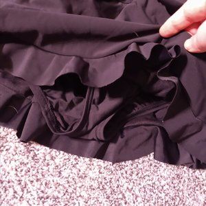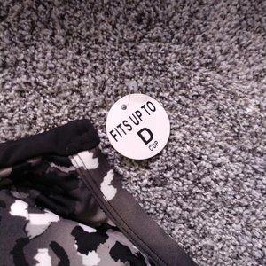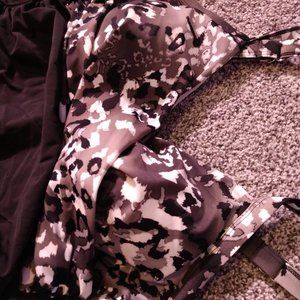 Plus-size, swim-dress style bathing suit/swimsuit with padded cups and cute ruffle detail at the bottom. Black with a gray, black and white animal print on the top and silver metal hardware. NEW with tags!