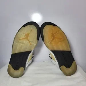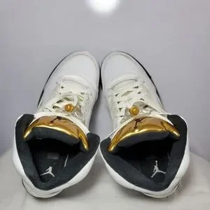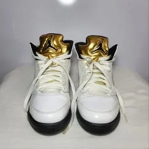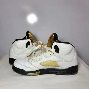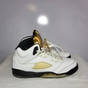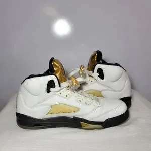 GS Air Jordan 5 Retro 'Olympic ' Sneakers Size 7Y in Boys/ 8.5 in Women. Leather Upper with Metallica Gold and Mesh Inserts, Air Cushioning and Rubber Outsole. Sneakers are in Good Condition.