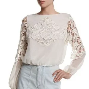 Alice + Olivia | Jenelle Long-Sleeve Lace-Trim Plisse Blouse