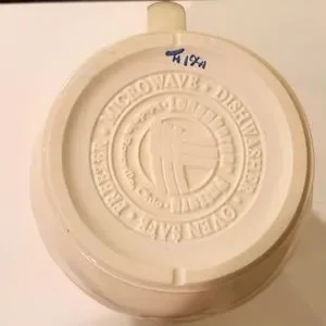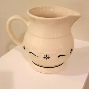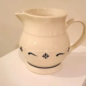 Longaberger Roseville Pottery Small Juice Pitcher dated & initialed! Woven Traditions Classic Blue with 4 petal motif in center. Made in USA by Friendship Pottery in Roseville, Ohio for Longaberger. New condition. Please see my closet for more Longaberger!