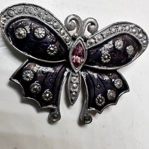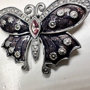 Vintage AAI signed dark purple enamel with pink rhinestone center butterfly brooch set in silver tone setting.