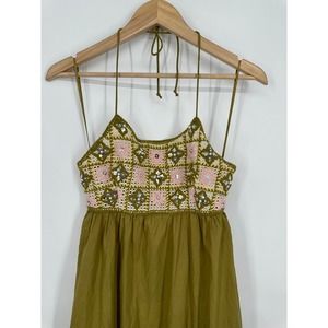 ZARA Granny Square Crochet Dress Halter Ruffle Knit Beaded Midi Green NWT
