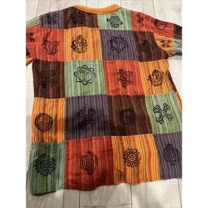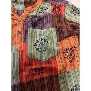 This handmade patchwork shirt by Karma Circle USA is a rare find for any style-conscious man. With a loose fit and grandad neckline, this shirt is perfect for any occasion from travel to formal events. The multicolor shirt features a button closure, long sleeves, and a hippie character graphic print that adds a touch of boho to any outfit.