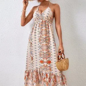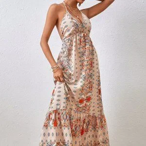Tan Boho Womens Women's Printed Backless Vacation Dress