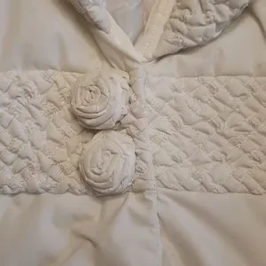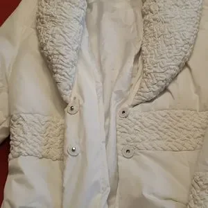 Women's size medium. Pure white fashion jacket with puffed collar and lapels. Two decorative rose snap closures at waist. Bell style sleeve hem.