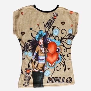 Y2k cowgirl hello graphic fashion western knit shirt Japan. No size tags but measures to be a fitted size medium. Size chart last photo. Vintage good clean condition. Feels like a very lightweight sweater material. Has some piffs and pilling due to age but overall good condition IMO. One of a kind piece!