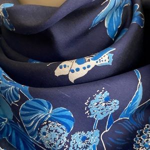 A floral blue silk scarf with butterflies from Thailand. Dark navy ground printed with sky, cobalt and indigo tones. Hand rolled hem. Good vintage condition, the label is coming unstitched. Perfect for the city or the tropics.