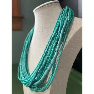 Teal Glass Seed Bead Multi-Strand Necklace -- 18"-- NWOTS. This necklace is brand new, never worn. Necklace has 16 beaded strands. Beads a bright and shiny and of varying sizes and beads. Necklace have gold-tone end caps and a gold-tone lobster clasp closure. Measurements: Length: 18"; Width: 2"; Extender: 4"
